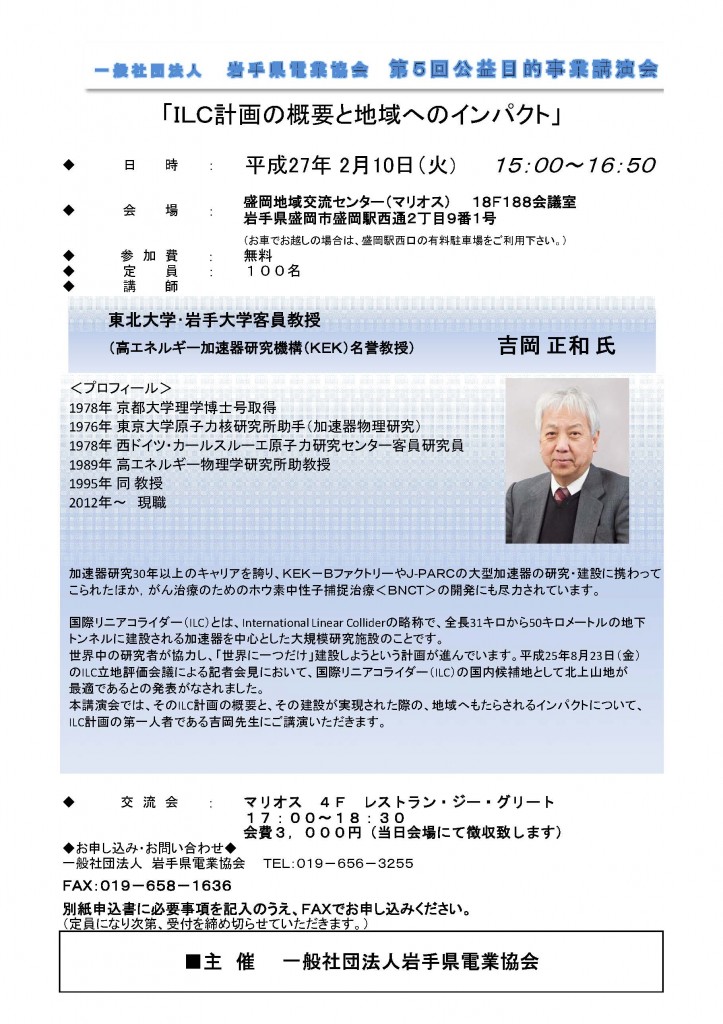 平成27年2月10日 第5回公益目的事業講演会 「ILC計画の概要と地域へのインパクト」 吉岡 正和
